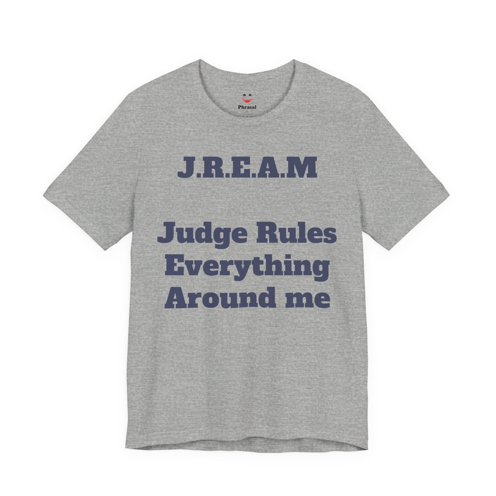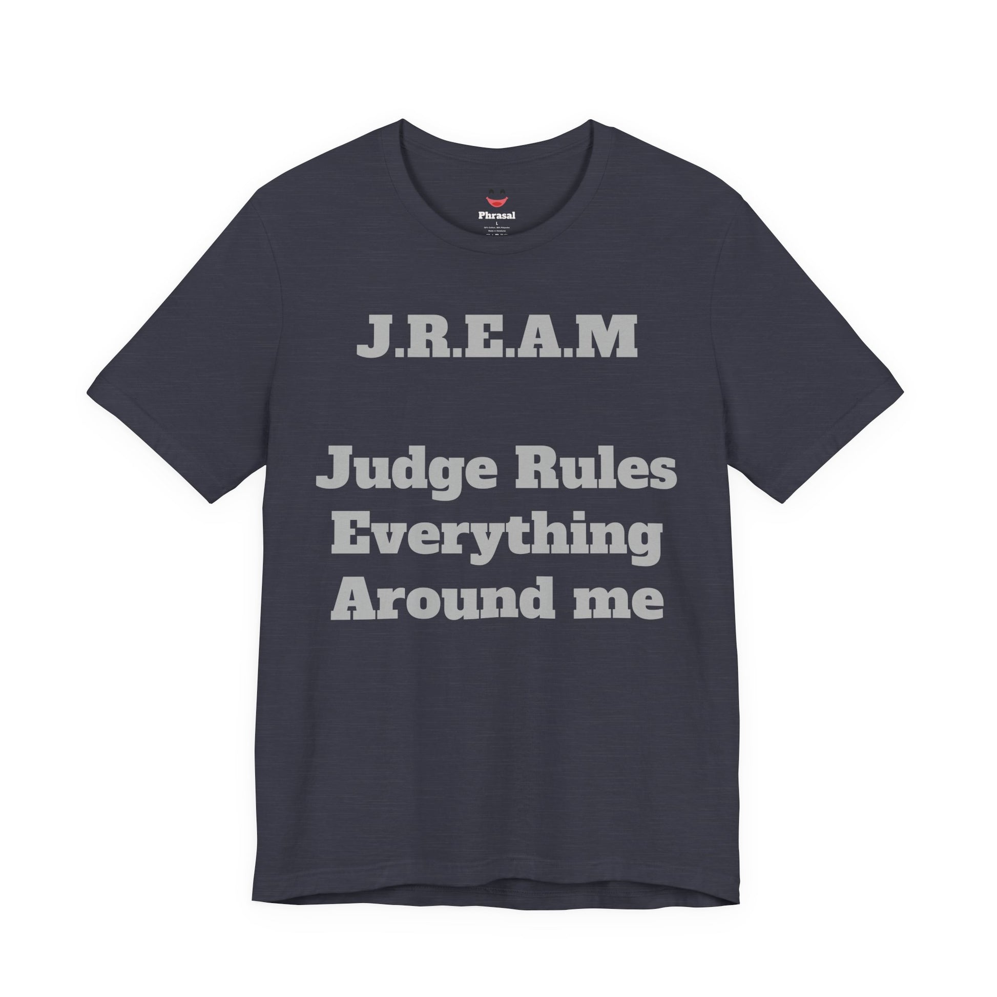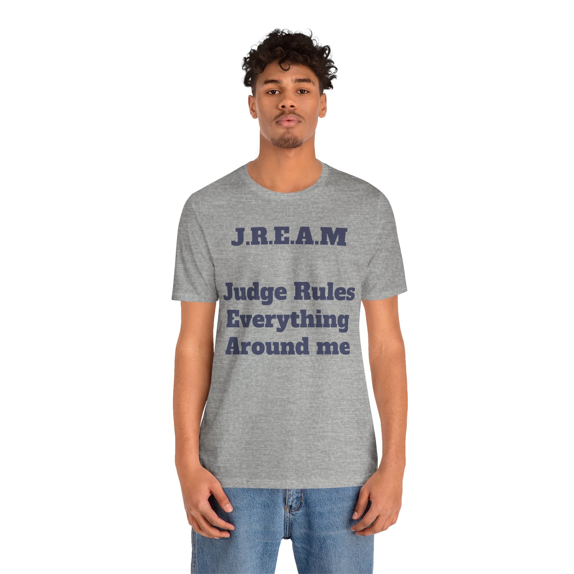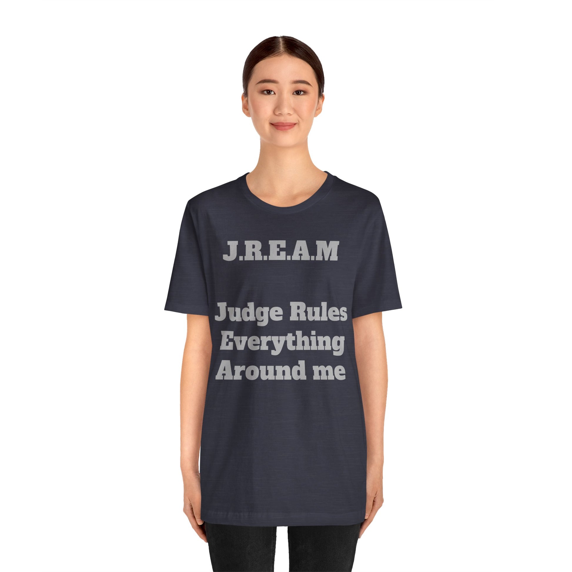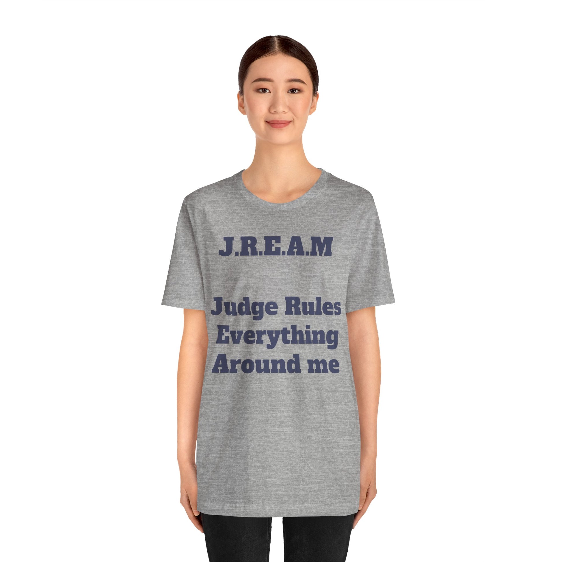 A soft, lightweight tee that wears like your favorite go-to and speaks with quiet wit. This crew-neck shirt carries a clean, collegiate-style print — “J.R.E.A.M — Judge Rules Everything Around me” — in a muted navy on a heather grey ground. The fabric feels breathable and airy, easy to layer under a jacket or wear on its own. It sits with a modern retail cut that’s relaxed without looking baggy, so it moves with you from coffee runs to courthouse study sessions. The overall mood is clever and a little sardonic, a subtle statement for someone who values humor, observation, and a smart, casual aesthetic. Thoughtful construction details like side seams, a ribbed collar, shoulder tape, and a tear-away label keep the fit neat and comfortable through repeated wear and washes.