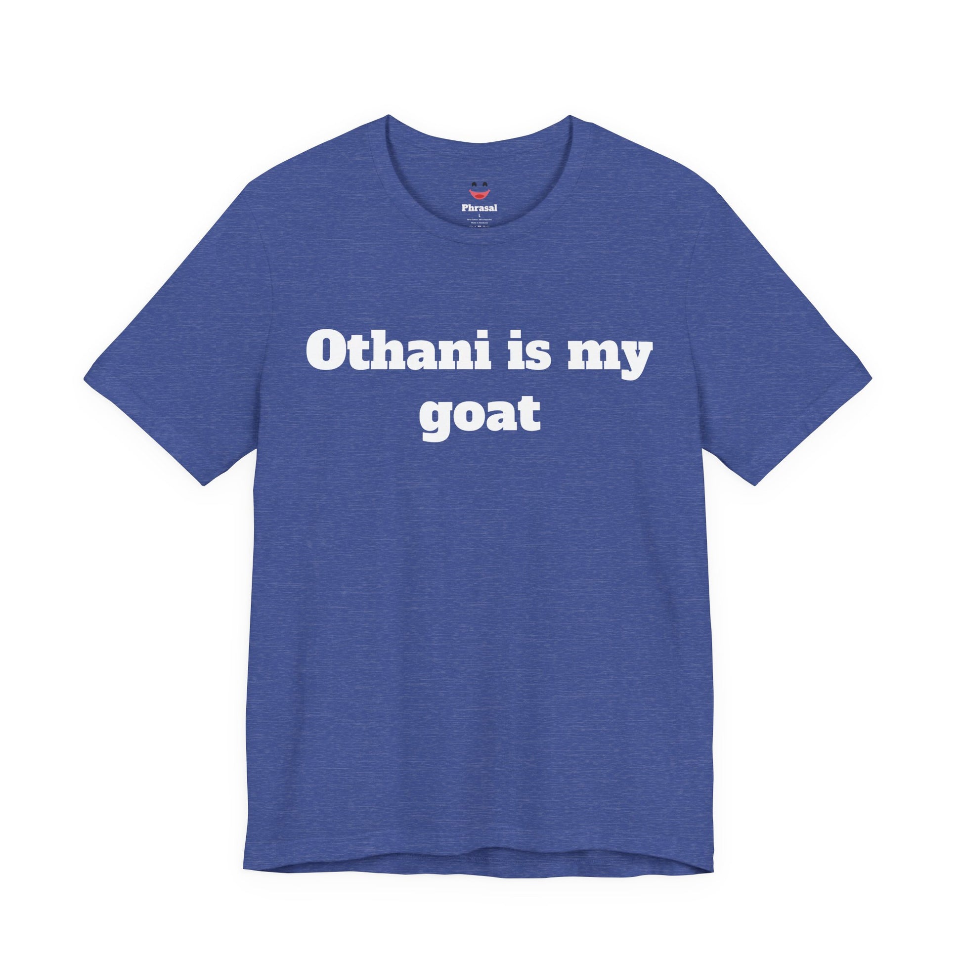 A lightweight, breathable tee that speaks like a sideline chant. Clean white canvas meets bold, collegiate-style blue lettering that reads "Othani is my goat" — confident, playful, and a little bit braggy. It sits neatly at the crew neck and keeps its shape thanks to ribbed knit and shoulder taping, so it looks sharp whether layered under a jacket or worn solo on game day. The Airlume combed and ring-spun cotton feels soft against skin, and the tear-away label keeps it itch-free. The message lands loud without being loud: for fans who want to wear their admiration with a wink and a crowd-ready energy.