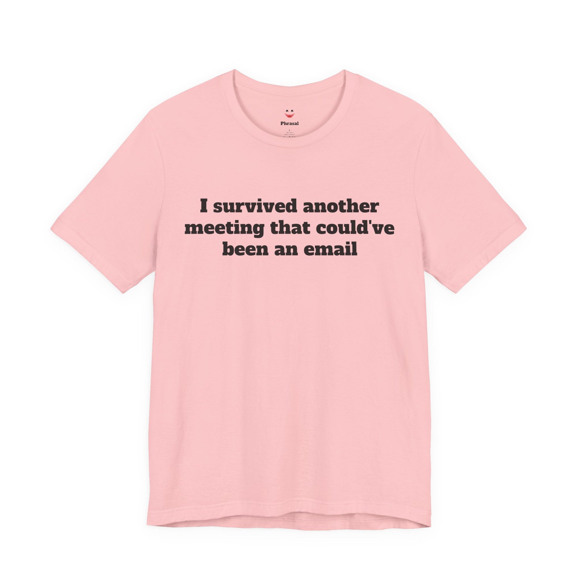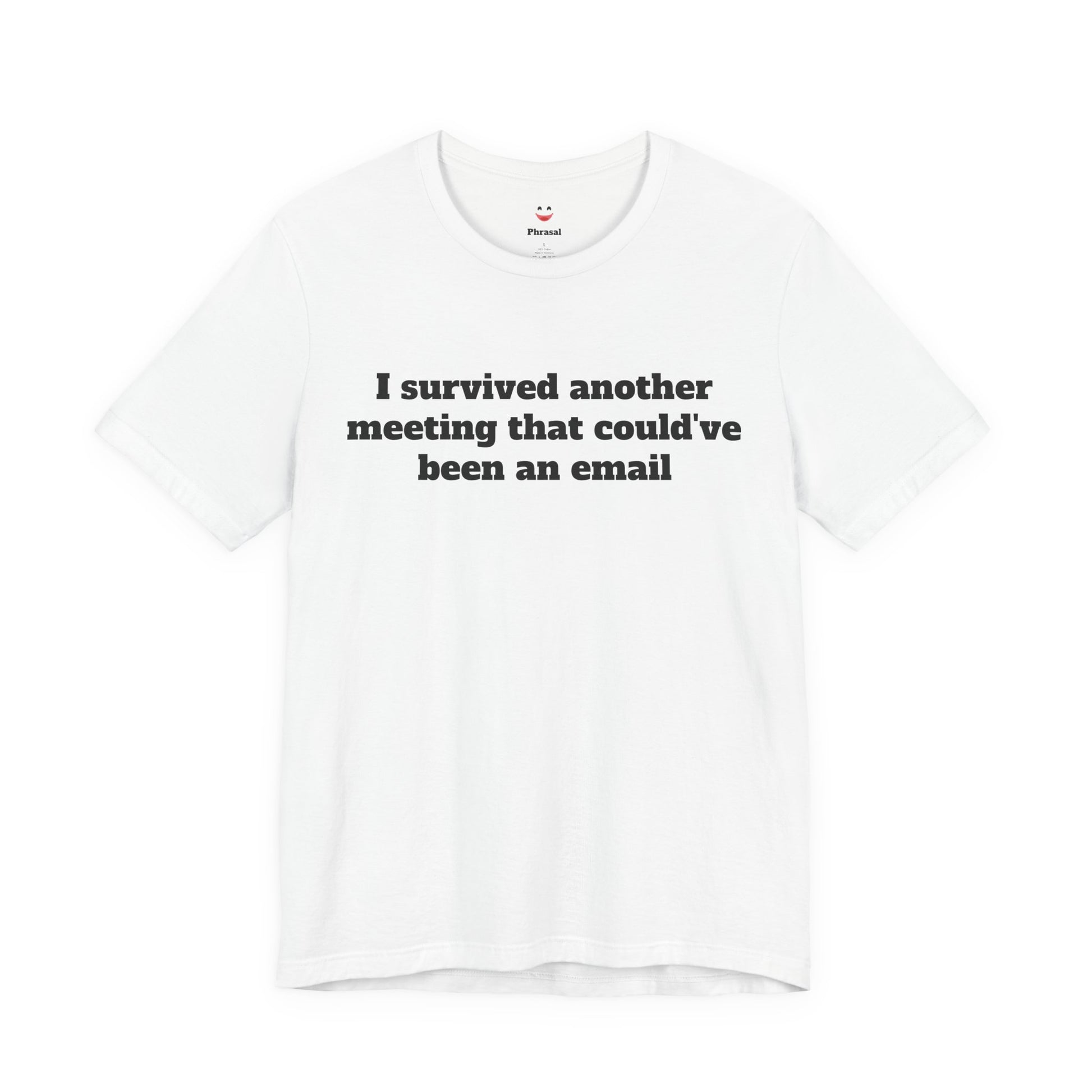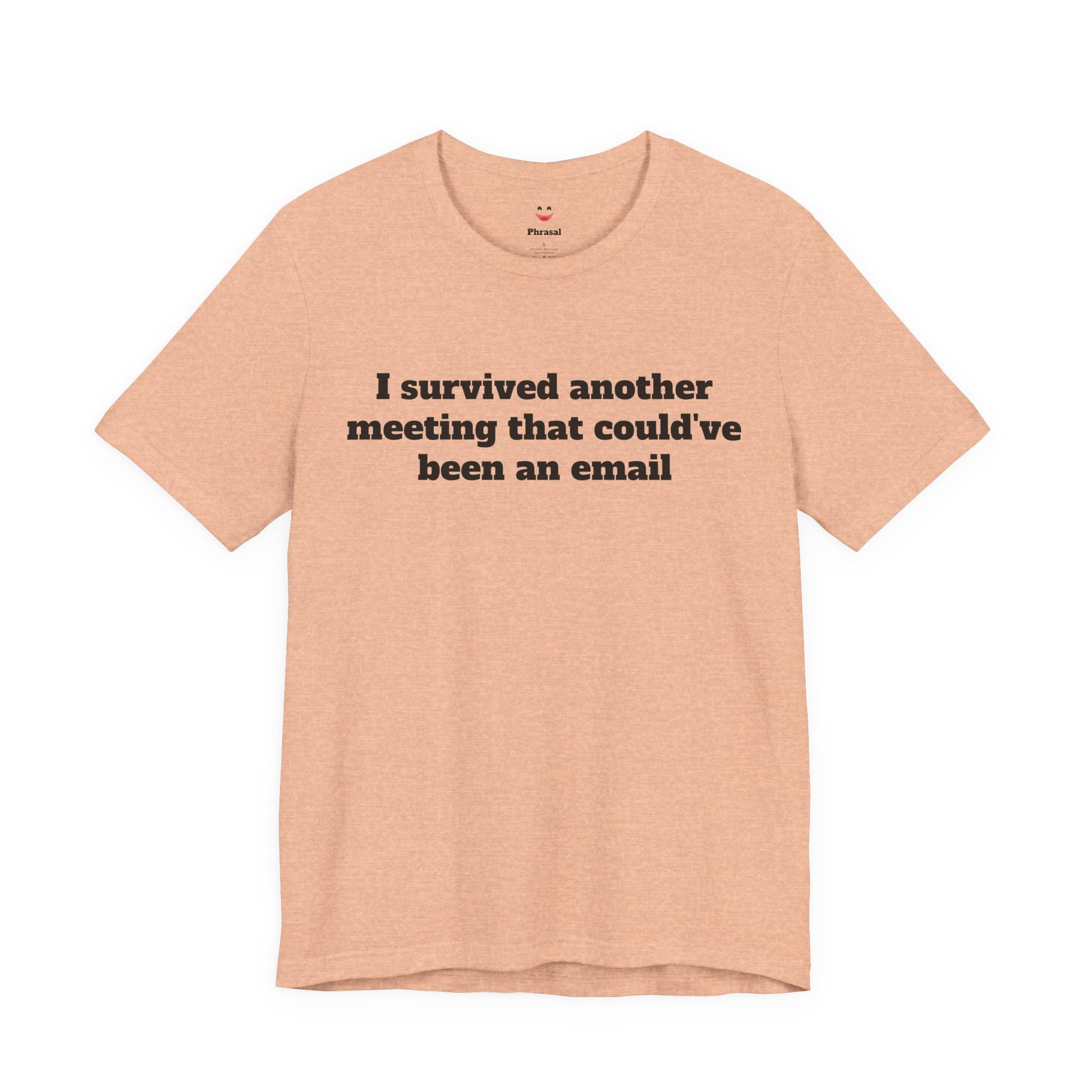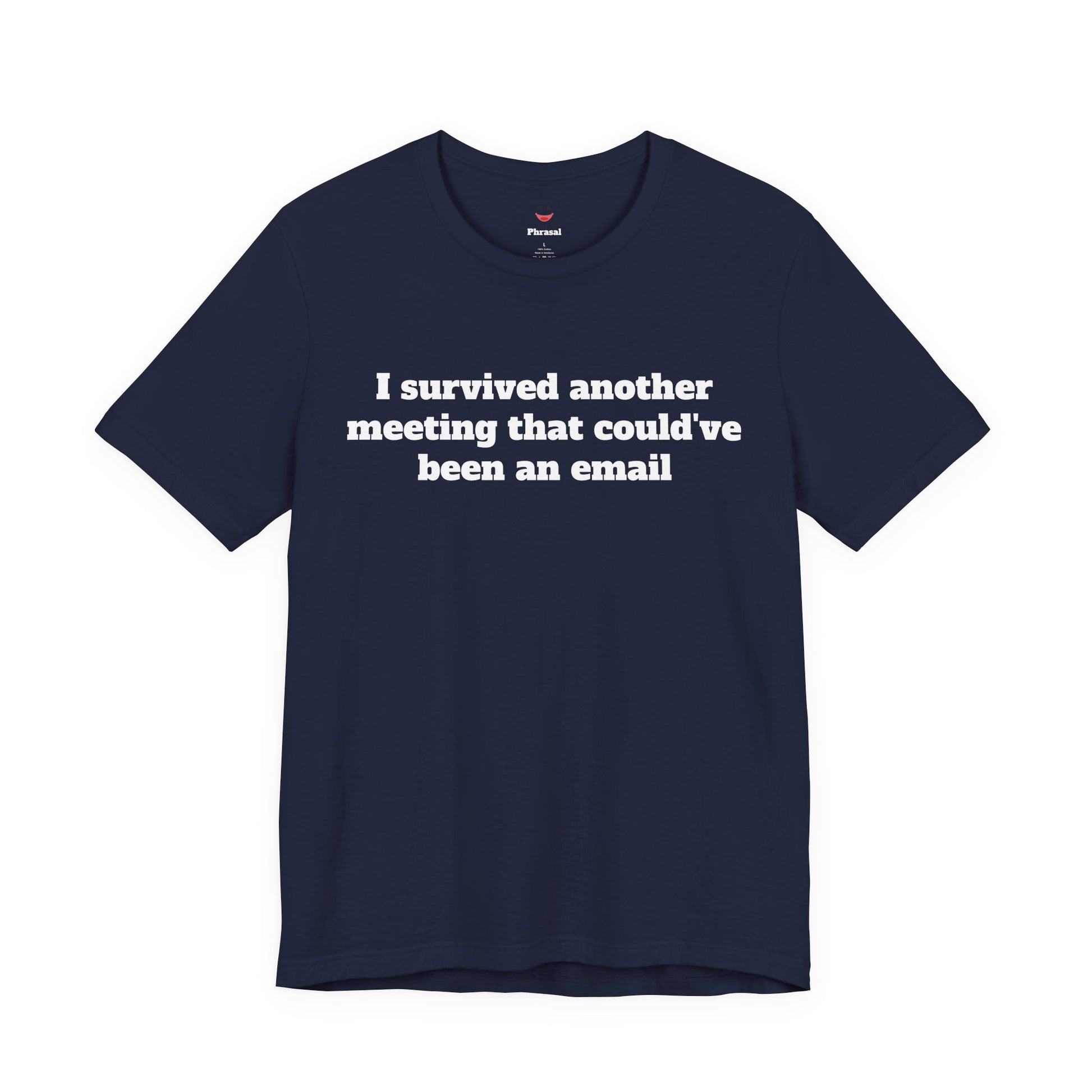 A soft, breathable crew-neck tee that speaks office truth with quiet wit. Lightweight Airlume cotton feels cool during long workdays and layers easily under blazers or hoodies. The minimalist front text — “I survived another meeting that could’ve been an email” — sits centered for low-key humor that lands in conference rooms and coffee breaks alike. Thoughtful construction (side seams, ribbed collar, shoulder tape) keeps the shirt looking crisp after repeat wears. Tear-away label and responsibly made fabric add comfort and conscience for everyday wear.