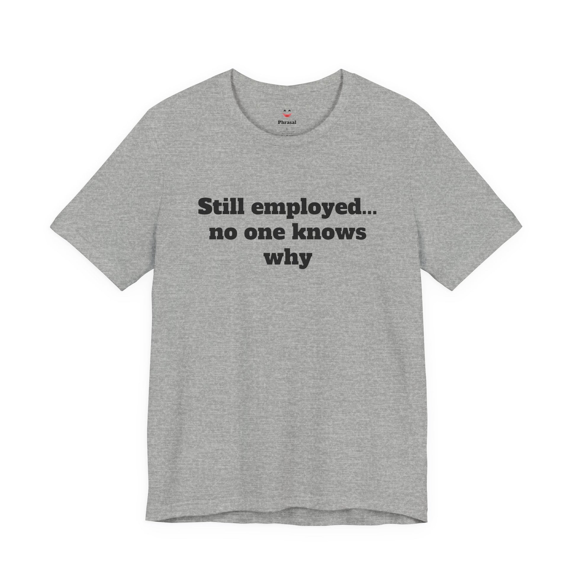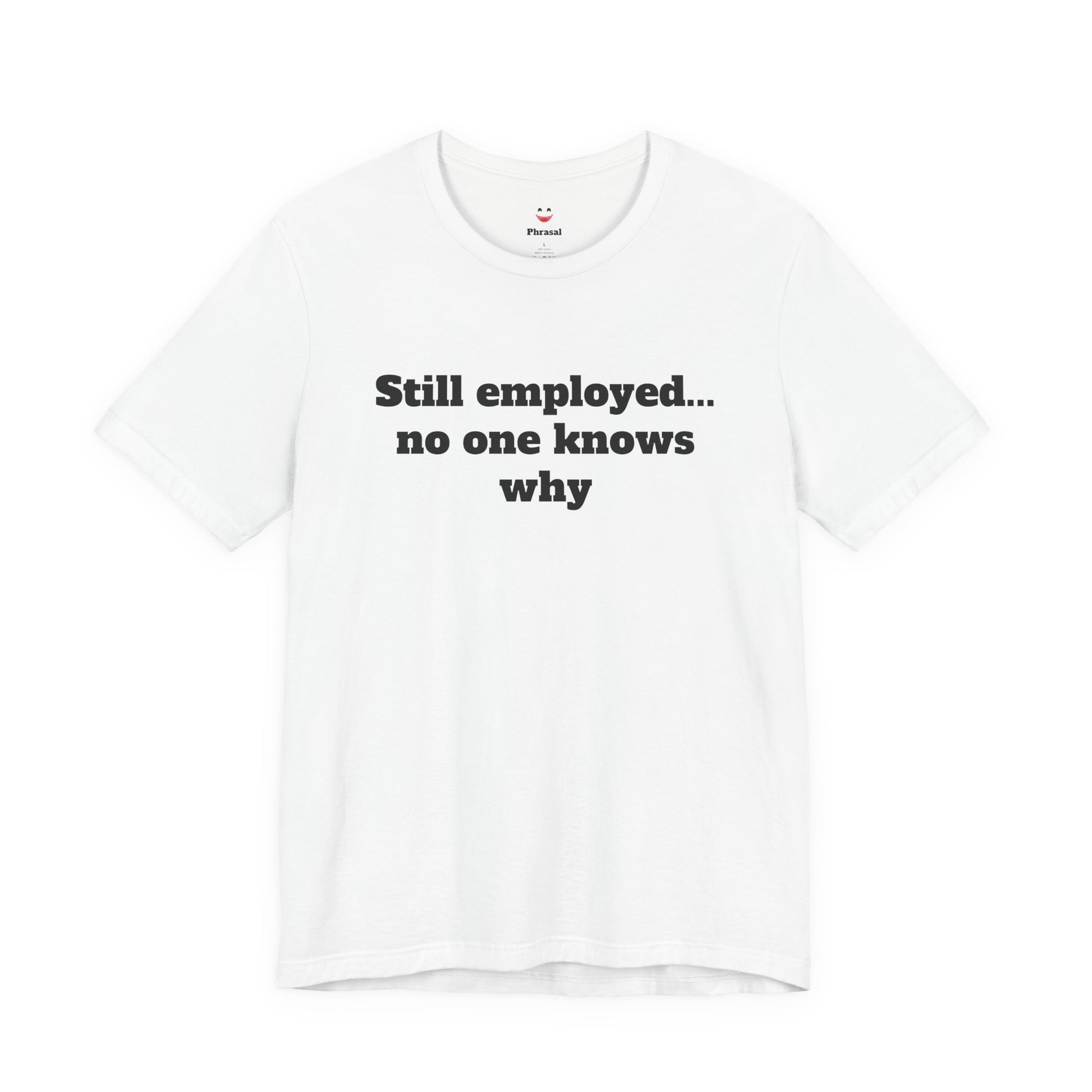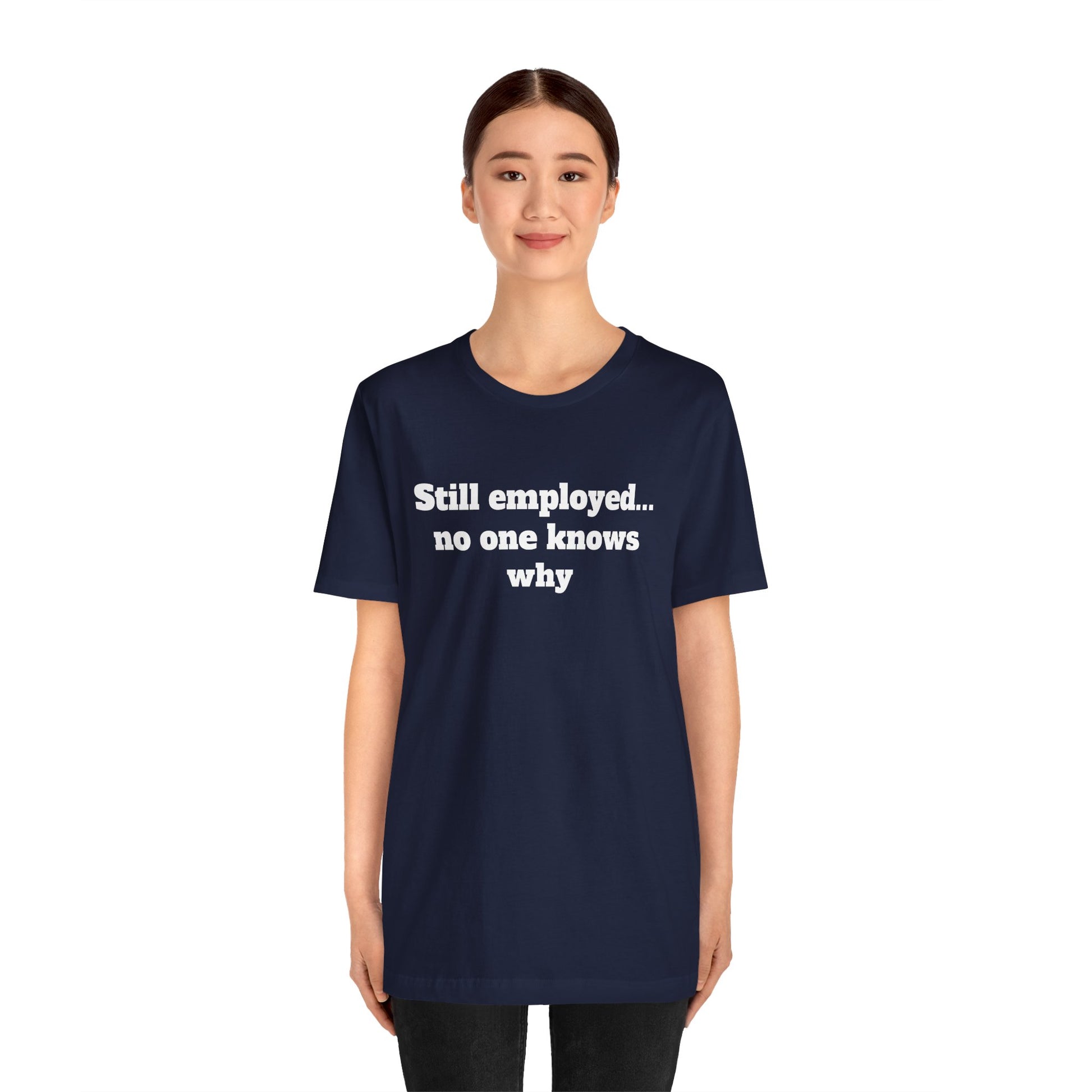 Soft, everyday tee with a wry sense of humor — a clean white crew neck that reads “Still employed... no one knows why” across the chest in understated, easy-to-read type. Lightweight Airlume cotton keeps the shirt breathable and comfortable whether you’re running errands, grabbing coffee, or leaning back at a low-key office meeting. The retail fit sits neat at the shoulders and torso, so the joke lands without shouting. Thoughtful details like a ribbed knit collar, shoulder tape, and side seams keep the shape wash after wash. Tear-away label and responsibly made fabric make it an easy choice for folks who care about comfort and ethics as much as a good one-liner.